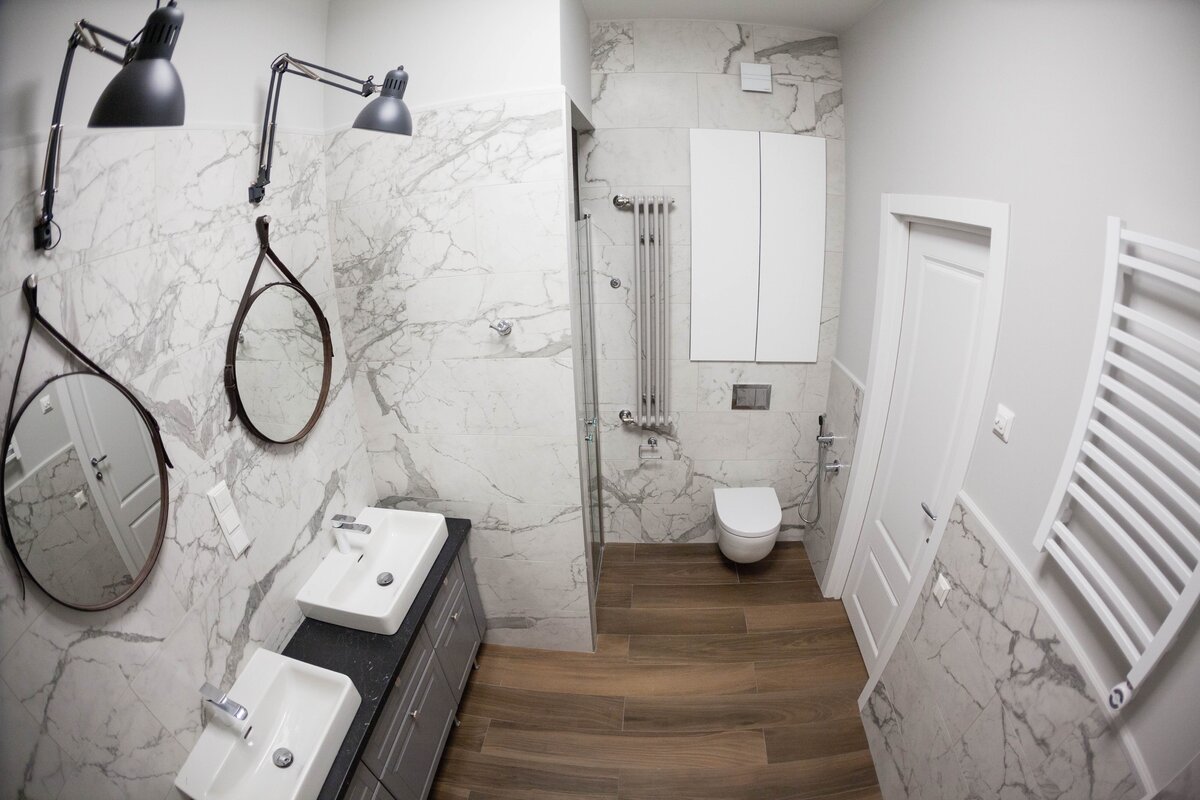 А если вам очень хочется определённую плитку, но она никак не встает идеально без подрезок — что тогда? А тогда сделайте санузел под эту плитку. Да, так можно — если гора не идёт к Магомету… Можно взять и рассчитать размер санузла под размер нужной плитки, но помните, что плиточный клей, выравнивание стен, швы — всё это будет влиять на конечный габарит санузла.