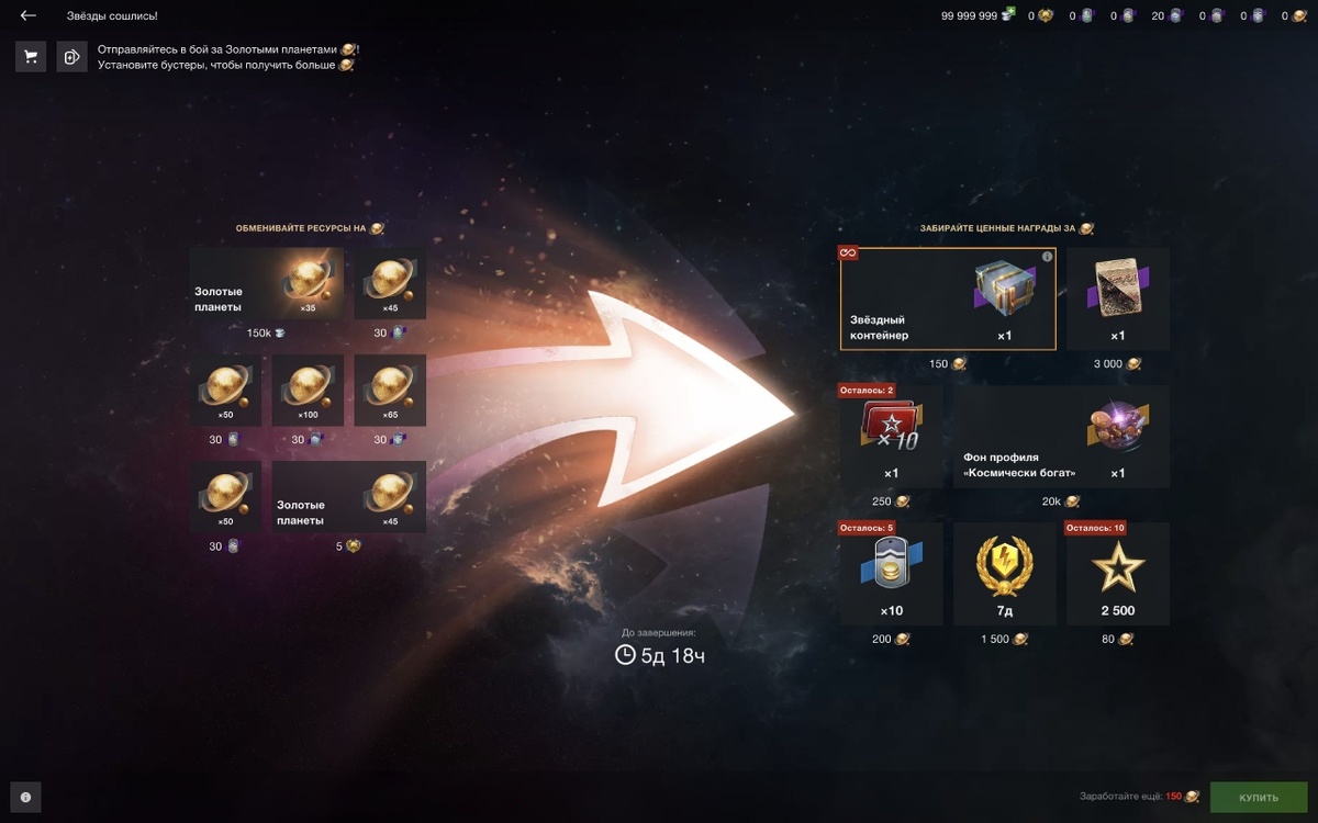 Однако недавно появилась информация, что золотые планеты (валюту ивента) можно будет получать в боях! За бой 2 планеты, а бустеры (?) Увеличивают их количество за бой!