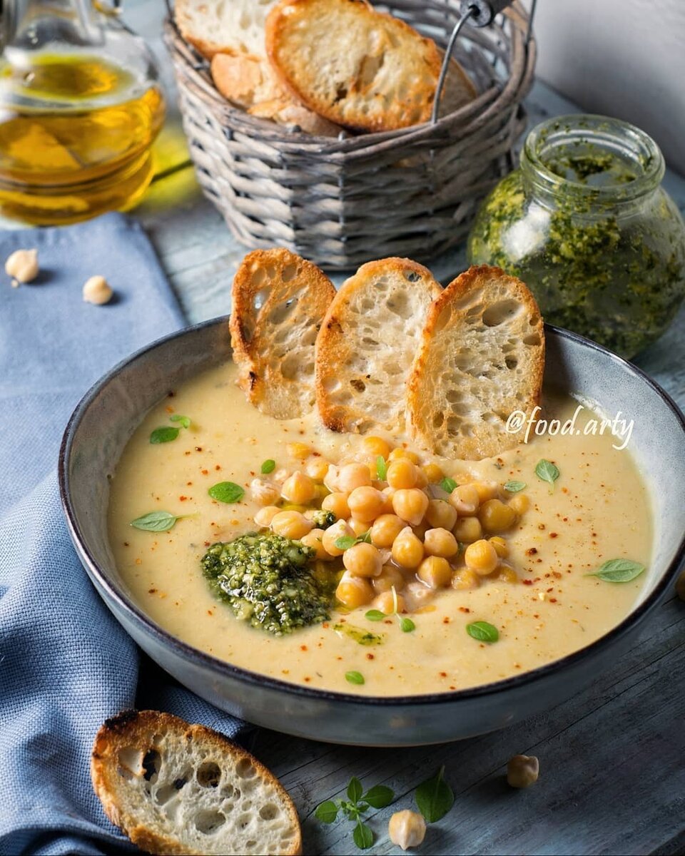 Ломбардийский суп с нутом (на 4 порции).Ингредиенты: нут - 250 гр , морковь, лук репчатый по 1 шт, соль, черный перец по вкусу, букет гарни (или можно хотя бы просто тимьян), чеснок - 1 зуб, чиабата - 1 шт, соус песто - 4 ст.л., масло оливковое - 4 ст.л.Приготовление. Нут замочить на 3-4 часа, затем залить водой, добавить очищенные лук и морковь целиком, довести до кипения и варить 40-60 мин до