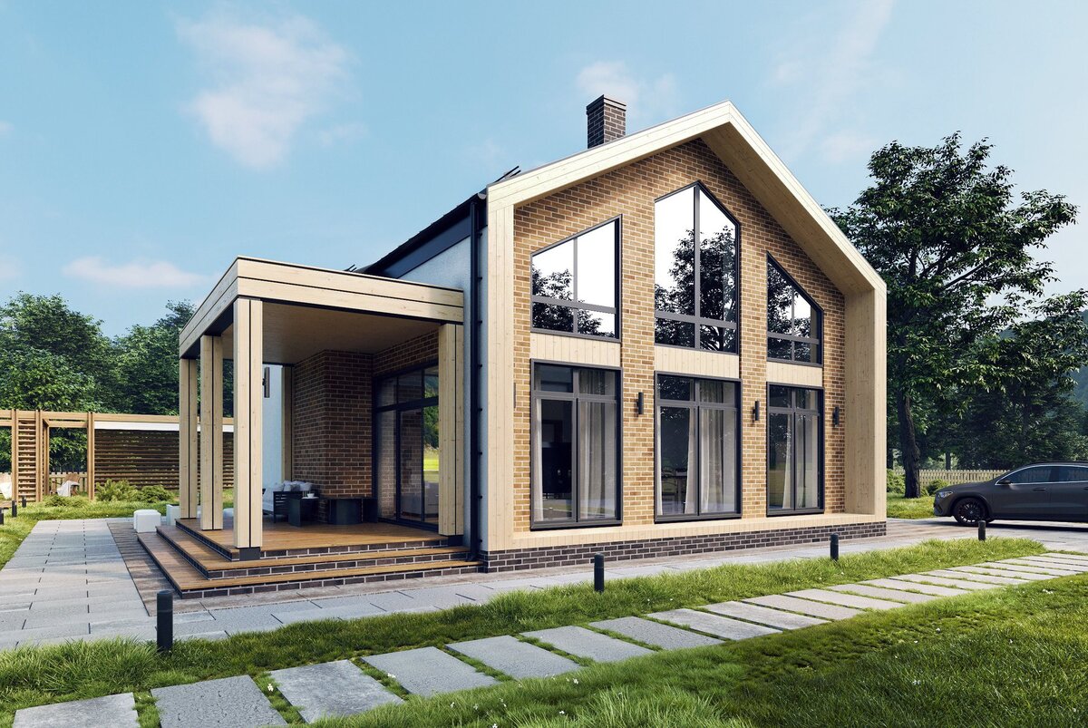 Интересно обыграна внешняя отделка дома: здесь используются две расцветки облицовочного кирпича в разных оттенках серого, а окна и выступающие части дома украшены декоративной доской.