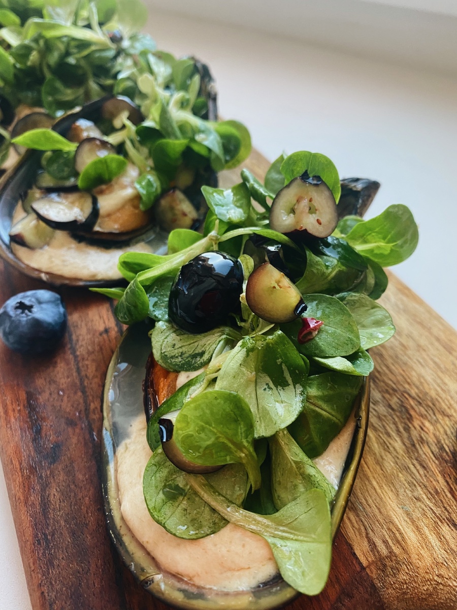 Мидии выкладываем для подачи и украшаем их корном с черникой.