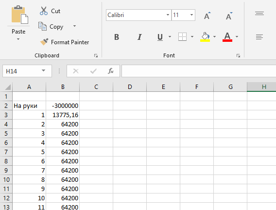Как считаем? В экселе, конечно. Нам поможет функция ВСД (IRR). Выписываем весь денежный поток: