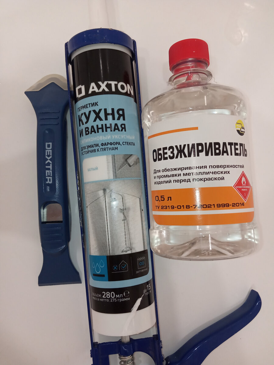 Для начала необходимо отделить ванну от стены, это делает при помощь ножа, разрезая им герметик, который прочно фиксирует ванну у стены. Далее отделяем ванну (если ваша ванна прикреплена к стене дополнительно петлями, не забудьте снять её с них, дабы не вырвать из стены). Следующим шагом идут очистка ванны и стены от старого герметика, в этом хорошо поможет скребок для очистки керамических плит/лезвие/нож и обезжиривать. После очистки ставим ванну к стене в исходное положение, при необходимости регулируем высоту ножек (если есть) при помощи уровня.