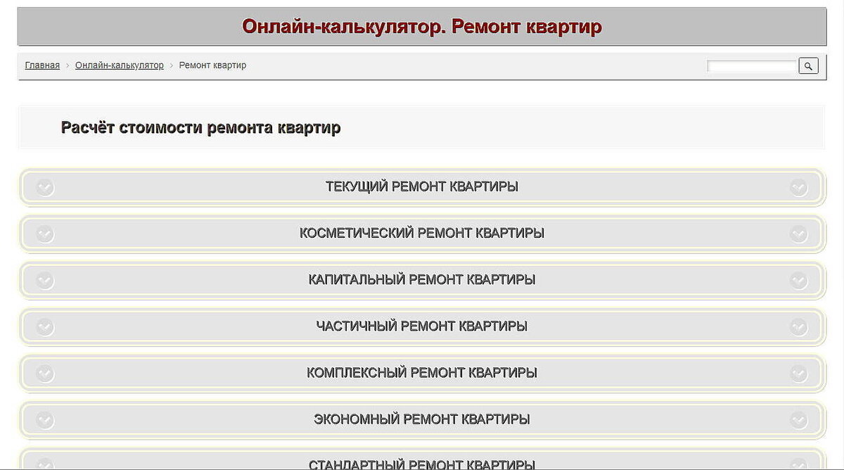 Наконец-то закончена разработка очередного раздела нашего сайта – ОНЛАЙН-КАЛЬКУЛЯТОР. РЕМОНТ КВАРТИР , с помощью которого можно будет самостоятельно рассчитать ориентировочную стоимость различных видов ремонтов с учетом комплекса выполняемых при этом работ. Оригинал статьи с краткой инструкцией по использованию данного онлайн-сервиса размещён ЗДЕСЬ