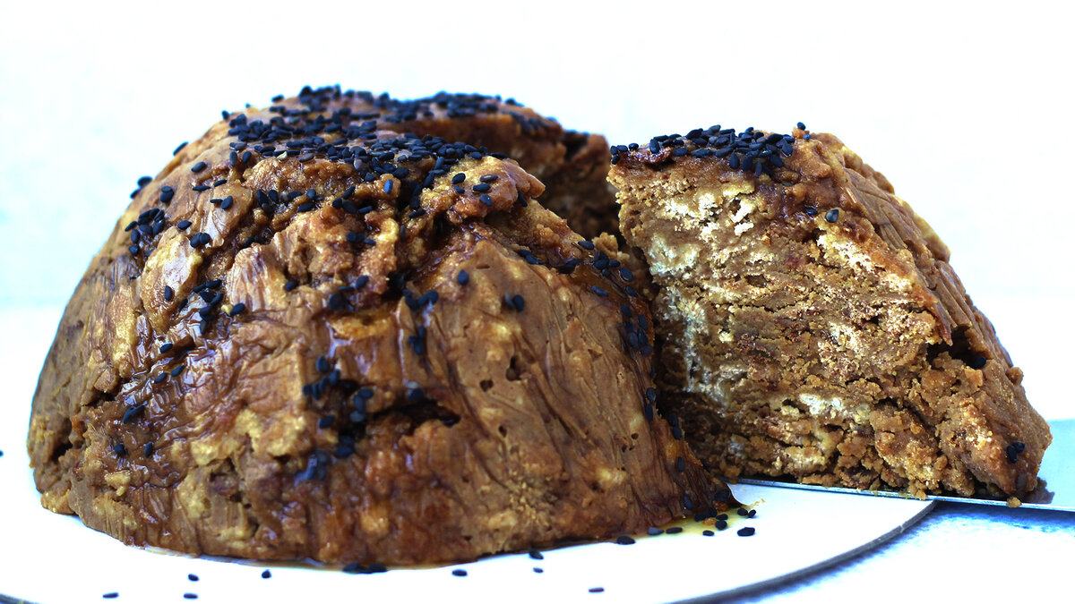 Когда торт настоялся, распаковываем его. Накрываем подложкой или блюдом. И переворачиваем. Снимаем чашу. И пленку. Вот такой рельефный муравейник получился. Поливаем его сиропом или медом. И я посыпаю черным кунжутом, можно выбрать мак. Это имитация муравьев. Вот такой простой домашний декор.
