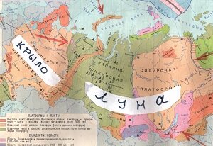 На иллюстрации приведена карта-схема, где указаны периметровые границы отрыва «основной» Луны и прилегающего к ней ее «крыла». При этом можно сделать вывод о том, что Сибирская платформа, Западносибирская плита и Русская платформа, а так же прилегающие к ним некоторые территории, образованы интрузивными магматическими процессами между Землей и Луной и являются дном полостей между ними.