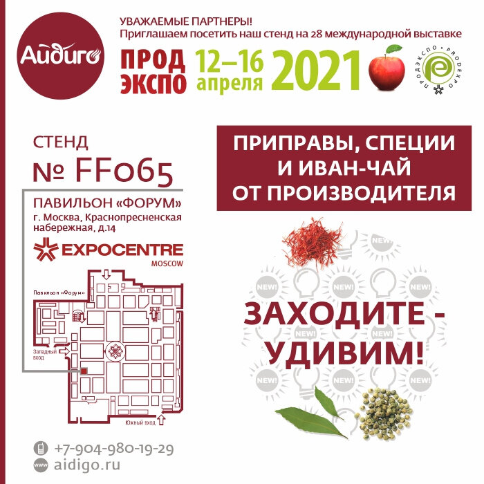 С 12 по 16 апреля 2021 года в московском "Экспоцентре" вот уже в 28-й раз пройдет выставка продуктов питания, напитков и сырья для их производства " Продэкспо". И компания "Айдиго" традиционно принимает участие в этой выставке, представляя свои лучшие продукты и новинки.