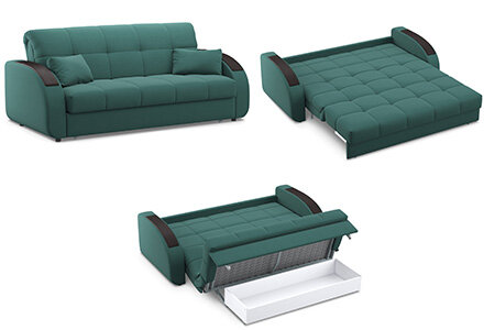 Конструкция предусматривает использование мебели в качестве дивана или кровати. В сложенном виде две панели складываются, прилегают друг к другу, образуя спинку, а одна остается разложенной, служит сиденьем. Для трансформации в спальное место, достаточно полностью разложить каркас, чтобы три части стали одной поверхностью.
