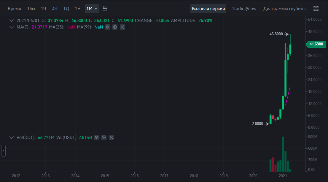 В долгосрочной перспективе эта монета может показать очень хороший результат! Сейчас стоимость одной монеты Polkadot. равна 3000 рублей. Хотя совсем недавно, в августе 2020 года, эта монета стоила все 2 доллара США. Многие профессиональные трейдеры держат у себя в портфеле эту криптовалюту и ждут её взлета! Ниже показан график роста криптовалюты Polkadot. В чем уникальная особенность Polkadot. ? Polkadot состоит из множества различных парачейнов, что позволяет достичь необходимого уровня анонимности. Особенность системы в том, что транзакции могут проводиться одновременно и распределяться между блокчейнами. На официальном сайте сказано, что Полкадот – это «технология мультицепи». Говоря простым языком, это сеть, которая соединяет блокчейны. Она создает пространство, где могут быстро и безопасно обрабатываться и обмениваться данные из разных блокчейнов. Важный момент – без общесистемных обновлений или хард-форков . Это является целью данного проекта. Миссия Polkadot – изменить су