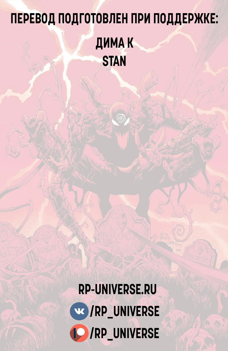 Карнаж возвращается - опаснее, чем прежде, и у него под прицелом все, кто когда-либо носили симбиотов! Разумеется, к их числу принадлежит и Эдди, из-за чего и его сын Дилан оказывается в непосредственной опасности. Из-за последнего фактора, возможно, даже придётся заручиться поддержкой старого заклятого знакомого... 60 страниц, три части, море экшена, хоррора, безумия и симбиотов! Грядёт