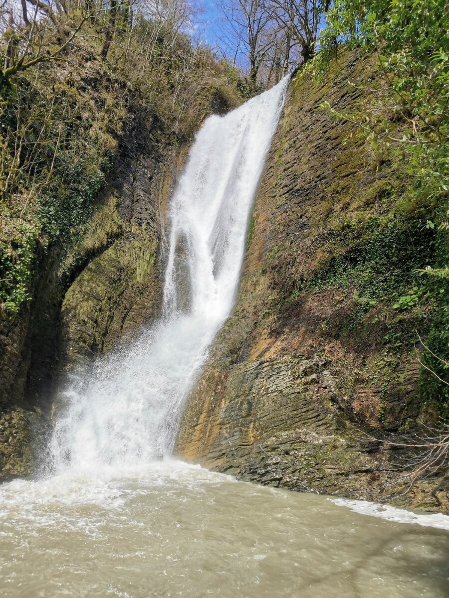 Это апрель в Сочи, реки собирают с гор тающие ручейки и шумными водами стремятся к морю, то пологим руслом, то обретая вот такую необыкновенную красоту, словно девушка распустила косы кудрявые сильные на воду, превратившись в водопад. Поехала к водопаду я на 102 автобусе с исторической и очень известной остановки самого центра Сочи "Платановая аллея". Ехать мне пришлось около часа, только в хорошей компании час пролетел незаметно и вот мы уже в селе Ореховка добрались до конечного пункта, а оттуда по указателям ещё 1,5 километра по просел очной горной дороге уже пешком пошли к водопаду. Только вышли из автобуса и перед нами бежит горная речушка, старенький, но устойчивый мостик через неё, собаки с добрыми глазами, видимо всегда сопровождающие туристов примкнули к нам. Лайка и рыжий пёс, похожий на лабрадора с умным и теплым взглядом стали нашими проводниками, молодые, игривые, забавные! Мой друг, что вообще не любил собак, но и он к середине нашего пути растаял от умиления, фотографируя их, гладя и на моих глазах превращаясь в счастливого мальчишку.