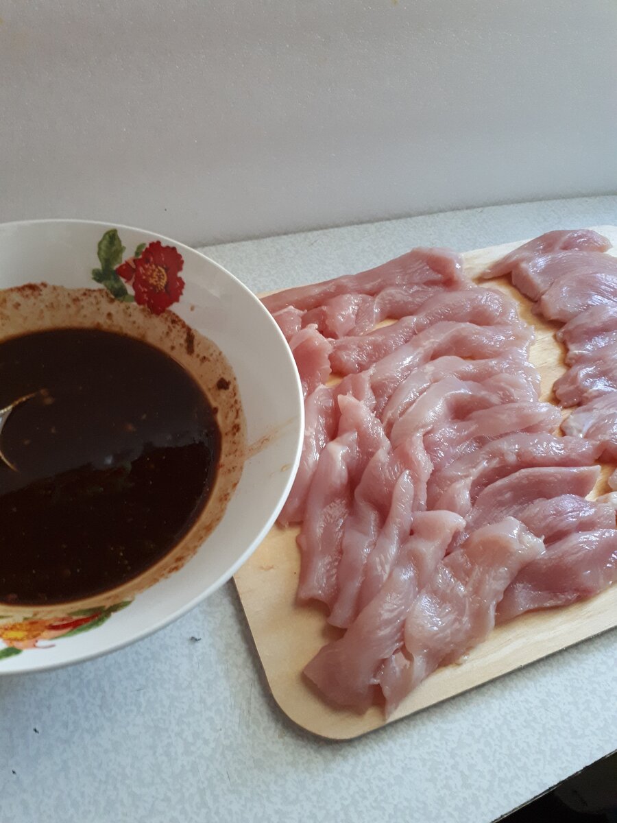 Достаем куриную грудку из холодильника, вынимаем все кусочки из маринада. Включаем духовку на 180 гр.
