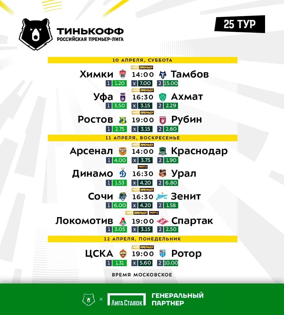 Расписание матчей 25-го тура Тинькофф РПЛ