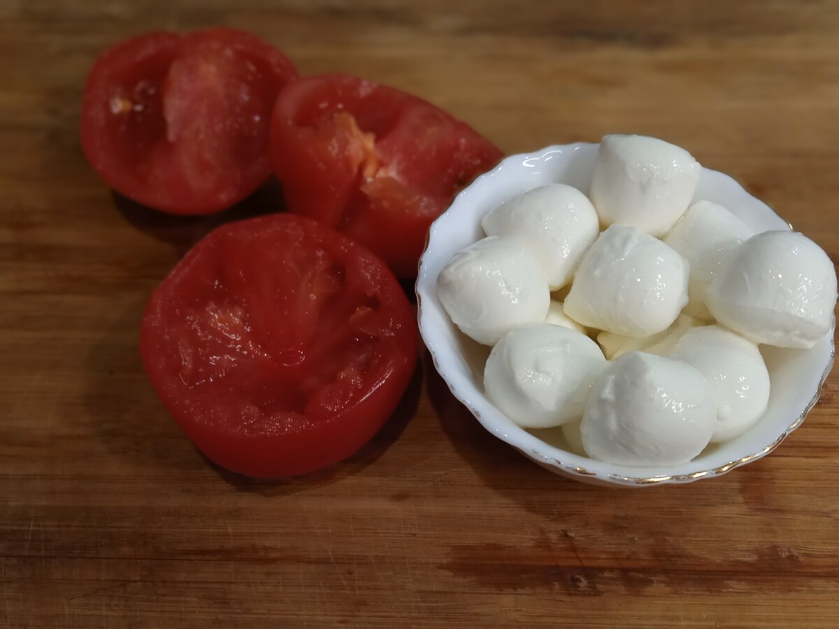 Базилик на месте. Приступаем к нарезке. Помидор, моцареллу и базилик рубим на мелкие кусочки, но не в фарш. Чтобы было приятно кусать. Ам!