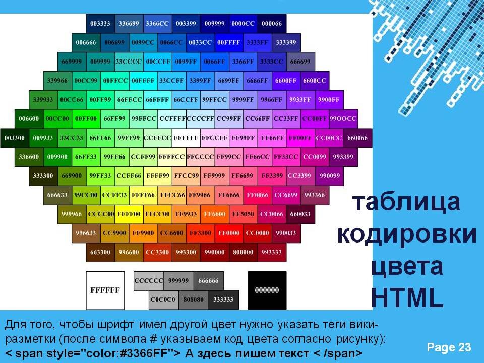 Вверху вы можете увидеть таблицу кодировки цвета в HTML. Эта статья будет полезна тем, кто читал прошлую статью, где я рассказывал как можно написать свой сайт. Так вот, в HTML можно изменить цвет текста! Сделать это можно с помощью тега </span>, как показано на таблице.