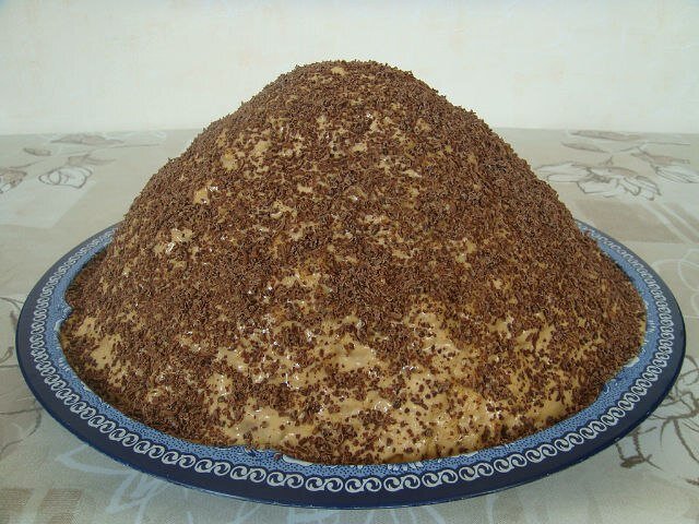 Замесить тесто, как на пельмени. Положить в морозилку, затем перекрутить через мясорубку. Полученные брусочки выпечь в духовке, после как остынут поломать, залить кремом, придав форму муравейника.