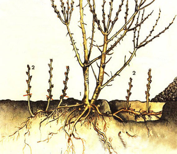 1 — маточное растение. 2 — корневая поросль.