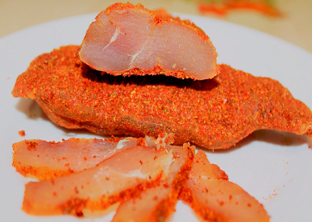 Бастурма – это вяленое на воздухе мясо, покрытое слоем острой приправы чаман.