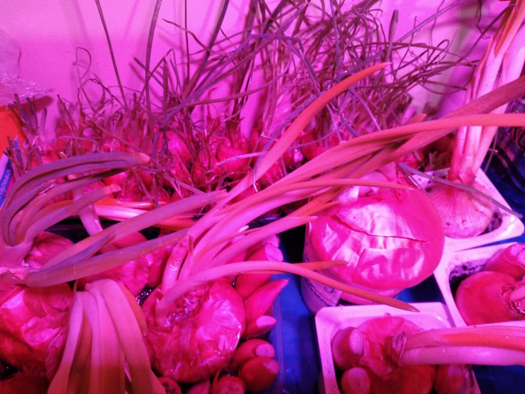 Я нашла простое решение. Беру проросший лук и сажаю во все возможные контейнеры, которые в принципе уже "отслужили".