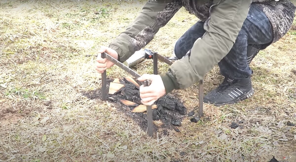 Всем привет друзья, сегодня сделаем очень удобный мангал из металлической полосы буквально за 30 минут. Длина двух заготовок у меня 1м20см. Сначала на 1-ой полосе металла отмеряю заготовки по 30см 4-ре кусочка, а на 2-ой 2-а куска по 40см и далее беру болгарку и отрезаю все заготовки. Далее на 4-рёх заготовок от одного края делаю разметку, чтобы немного заострить края, рисую линию и затем небольшие треугольники. Затем прижимаю струбциной и вырезаю. Далее находим центр и с каждого края делаю разметку. И далее наношу каждые 5см отметку, в будущем сделаем прорези. Далее зажимаем в тески заготовки и выпиливаем паз болгаркой а потом в бой идет напильник. И так 4-ре колышка готова у каждого есть паз и заострён край, откладываем в сторону и начинаем работать с двумя перекладинами. По краям также делаю паз. Чтобы отверстия были симметричны делаю сразу на двух заготовках одновременно. Ну и на последок делаю прорези болгаркой для шампуров. Далее собираем мангал в удобном для вас месте на нужно