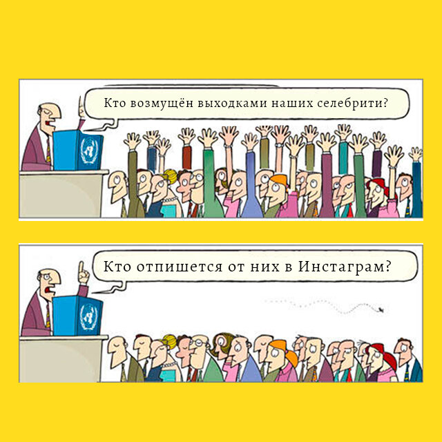 Оригинальная карикатура появилась 21 июня 2012 года, её автор бразильский художник Hoje em Dia изобразил собрание ООН. Здесь председатель собрания задаёт вопрос: «Кто хочет перемен?» и оказывается, что все. Но уже следующий вопрос «а кто готов отказаться от нерационального потребления?» кардинально меняет картину: руки людей опущены, растерянный взгляд «скользит по полу».