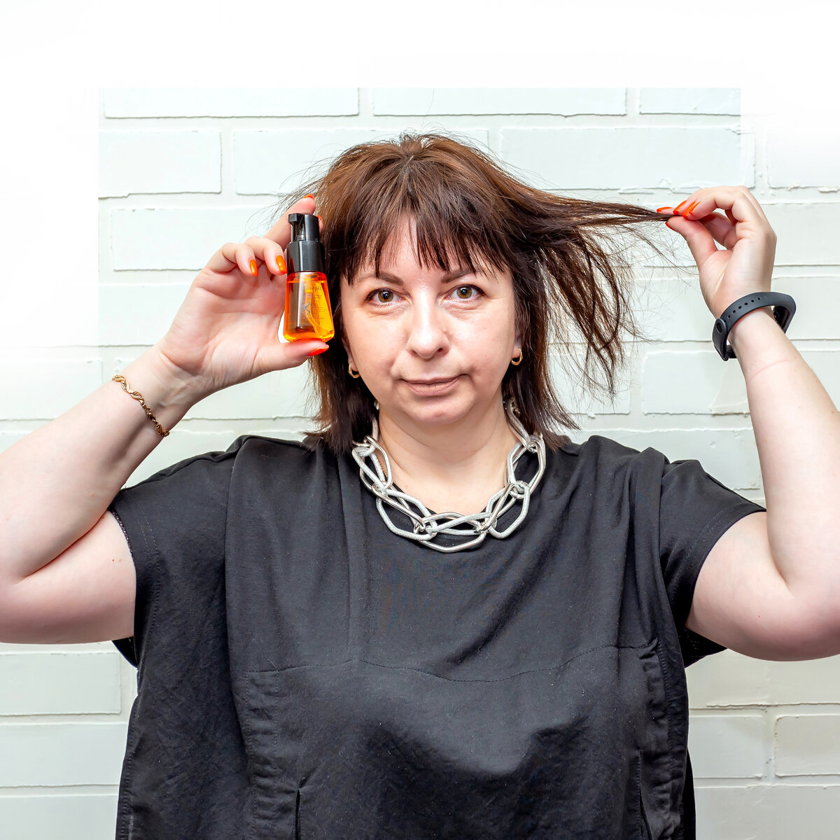 1. Наносим немного масла на чистые, подсушенные полотенцем, волосы и распределяем расческой. После этого приступаем к укладке волос. Волосы блестящие и шелковистые.