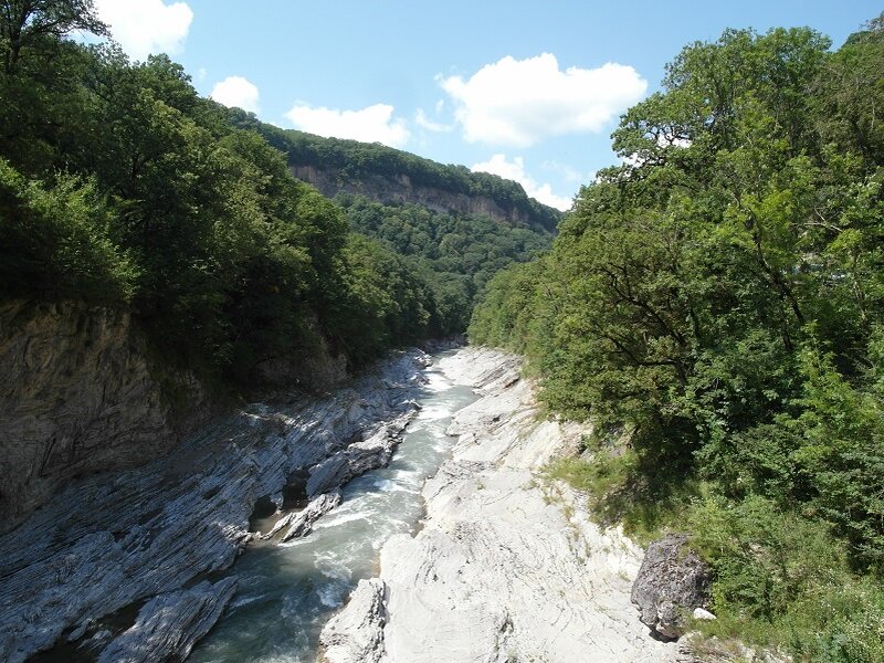3. Хаджохская теснина - это короткий, но глубокий каменный каньон в русле реки Белой. Расположен он очень удобно прямо у главной дороги республики, на окраине посёлка Каменномостский. Можно выйти из машины и пойти осматривать: