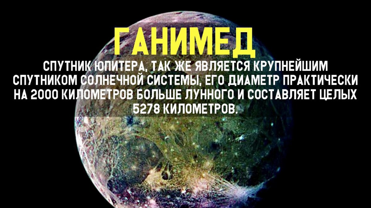 Ганимед состоит из примерно равного количества силикатных пород и водяного льда. Это полностью дифференцированное тело с жидким ядром, богатым железом. Предположительно, в его недрах на глубине около 200 км между слоями льда есть океан жидкой воды.