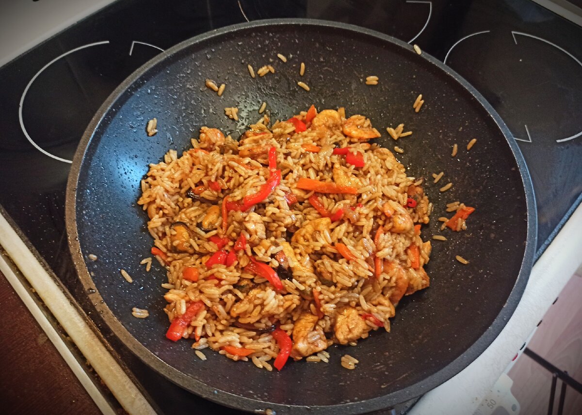 На мой взгляд это блюдо точно заслуживает вашего внимания если вы любитель азиатской кухни. За счет курицы и морепродуктов блюдо получается "легче" того же плова, имеет интересный, характерный вкус морепродуктов.