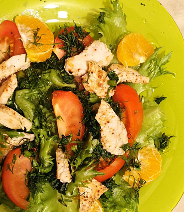 Подкопченое куриное мясо (нам можно варёное - его слегка присушить на сухой сковороде со специями), листья хрустящего салата (Фризе, Фриллис и т.п.), томаты, полукольца красного лука, петрушка и дольки апельсина (или мандарина), горчичная заправка.