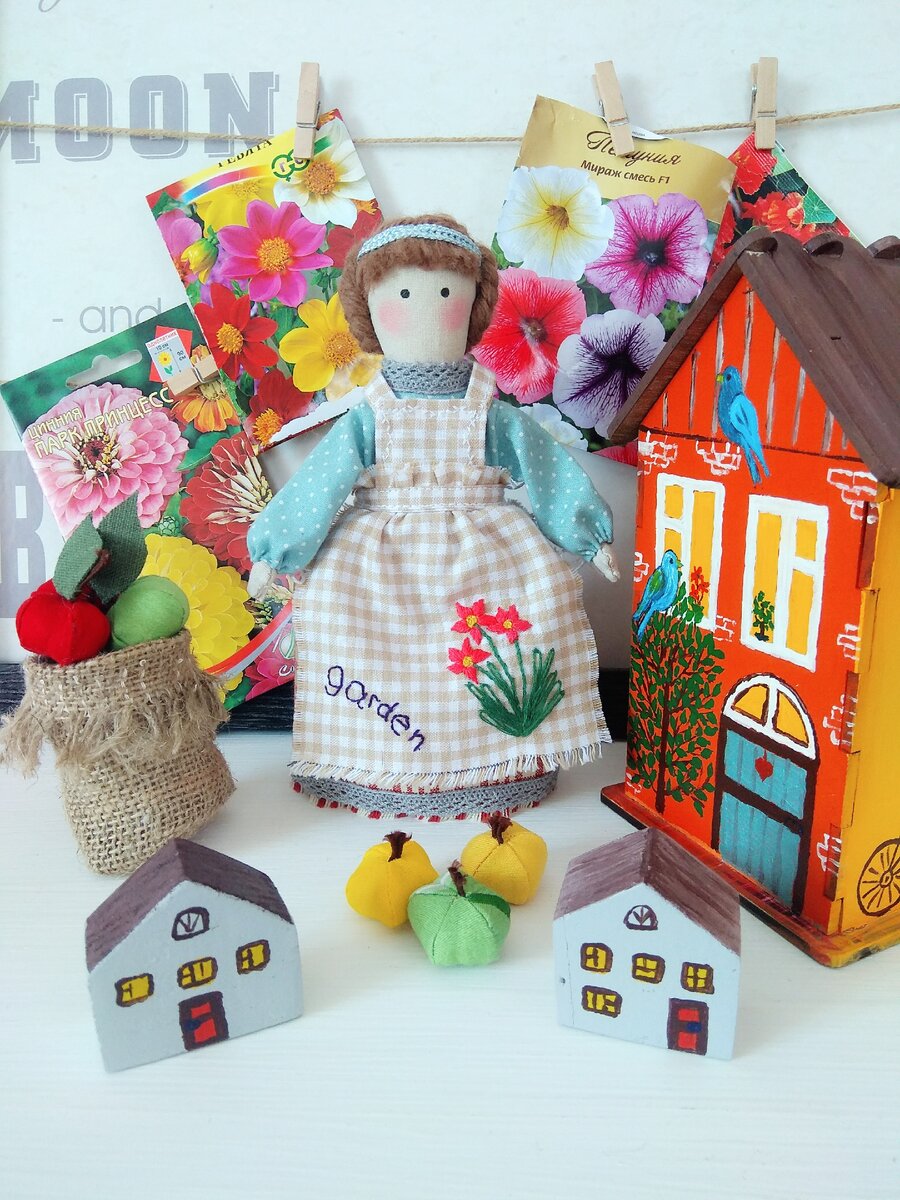 Вдохновение пришло вместе с весной ,захотелось сшить куколку садовницу. Получилась вот такая девчуля. На фартучке вышила надпись и цветочки.