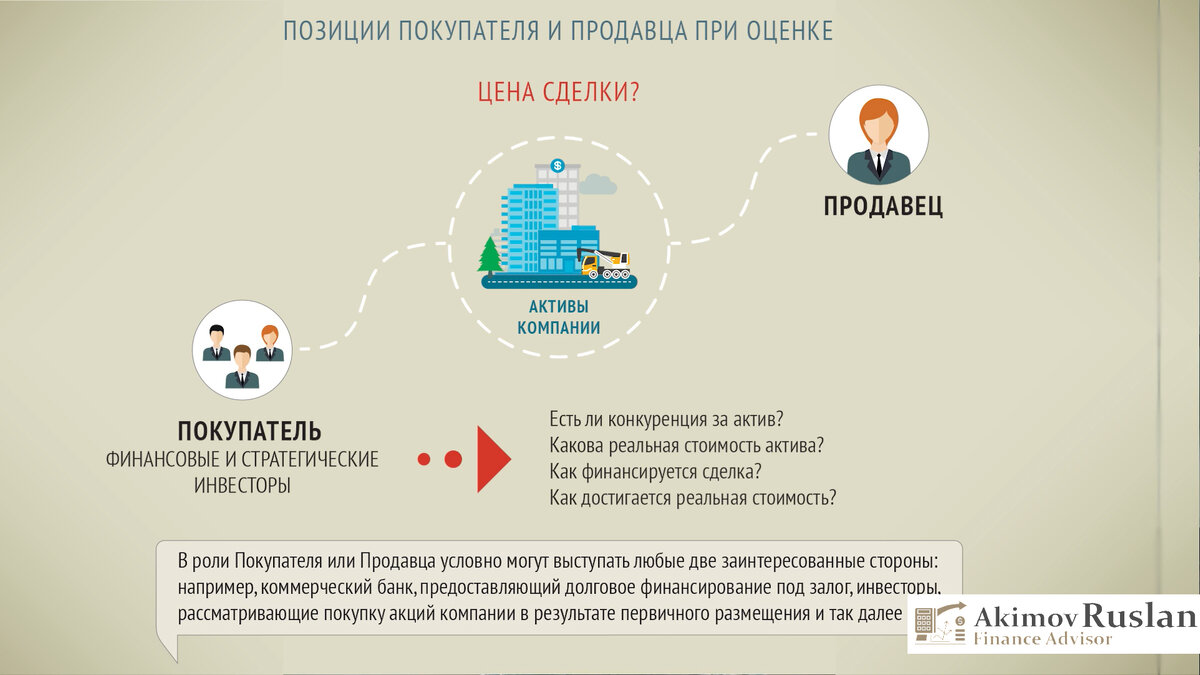На этапе анализа стоимости покупатель конечно задает себе множество вопросов влияющих на уровень реальной цены совершения сделки. Например: Какова реальная стоимость актива при условии, что я начну владеть компанией или долей в компании? Сколько я потрачу средств и усилий чтобы достигнуть реализации, этой реальной стоимости? Какой объем финансирования я смогу привлечь для осуществления сделки? Существует ли конкуренция за актив? И множество других.