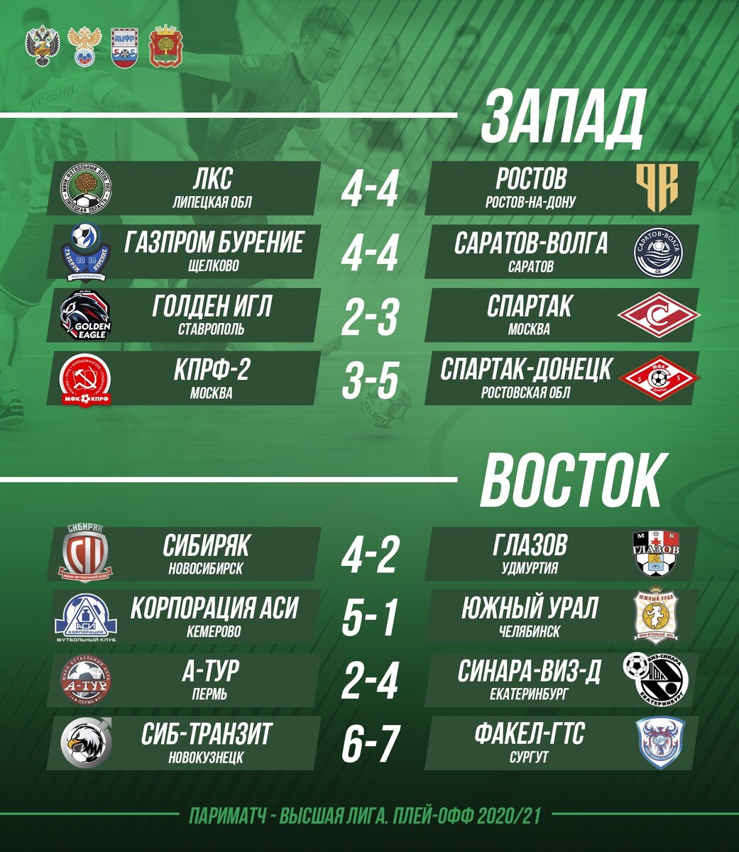 Состоялись ответные матчи 1/8 финала Париматч - Высшей лиги Первенства России по мини-футболу среди мужских команд 2020/21 гг. По их итогам борьбу за титул продолжат 4 клуба "Запада" - "Газпром Бурение", КПРФ-2, "Спартак" и "Ростов", 4 клуба "Востока" - "Сибиряк", "Корпорация АСИ", "Факел-ГТС" и "Синара-ВИЗ-д".