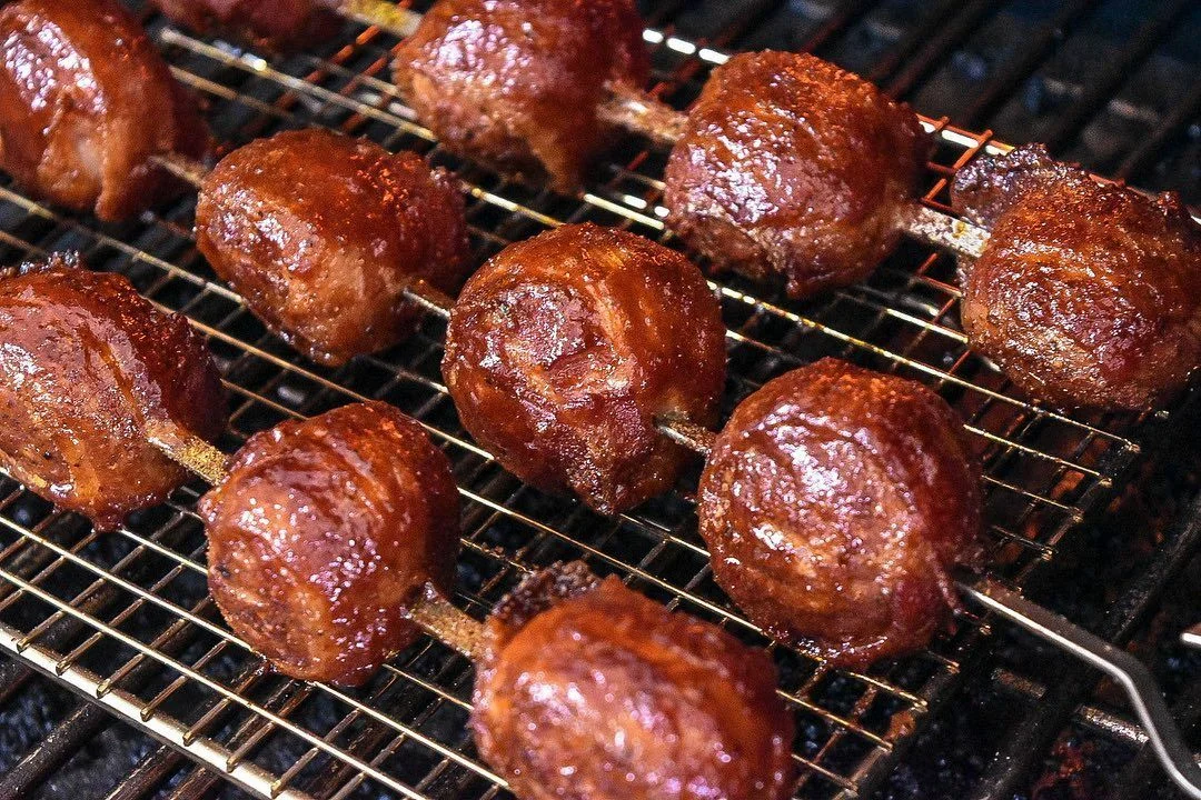 - Получившиеся мячики оберните тремя ломтиками бекона. Закрепите бекон зубочистками, чтобы он не развернулся во время приготовления.