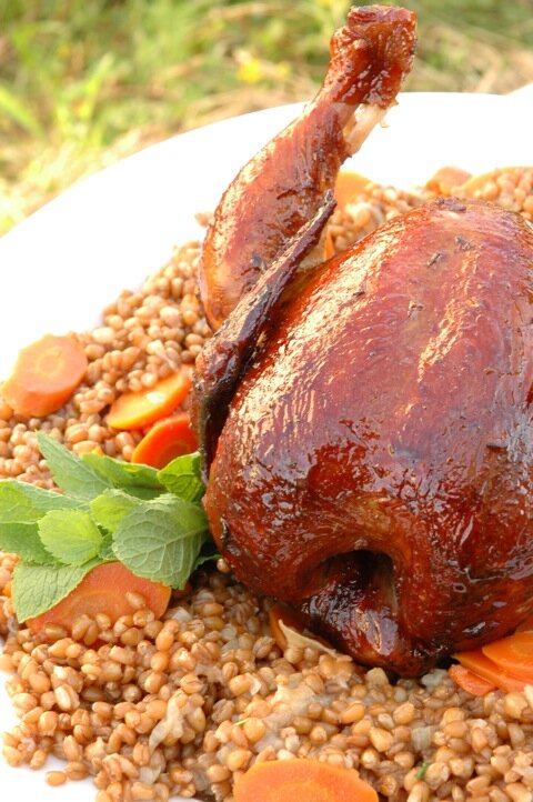 Курицу можно запечь в духовке или гриле. Курицу удобнее всего запекать на ростере. Насаживаем ее, заправляем вовнутрь кожу шеи и затыкаем специальной пробкой. На дно ростера наливаем немного воды. И ставим ростер с курицей в центр духовки или гриля. Закрываем. Вместо ростера можно использовать пивную банку. Готовим при температуре 150-170 градусов.