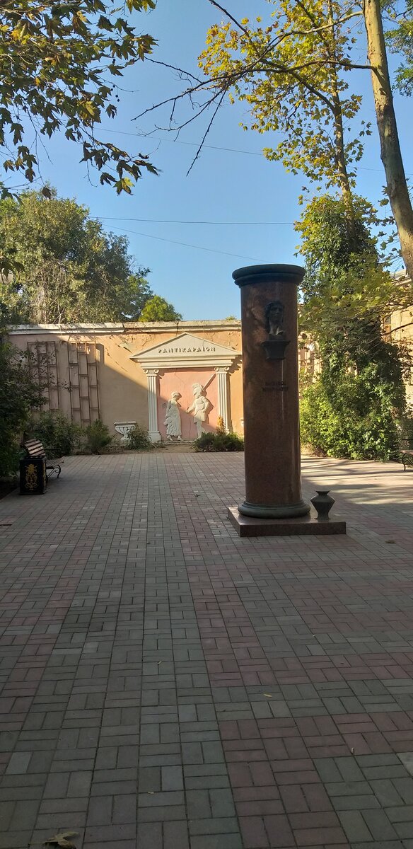 У подножия лестницы на фоне барельефа, посвященного Пантикапею, установлен памятник самому известному правителю Пантикапея понтийскому царю Митридату VI Евпатору.