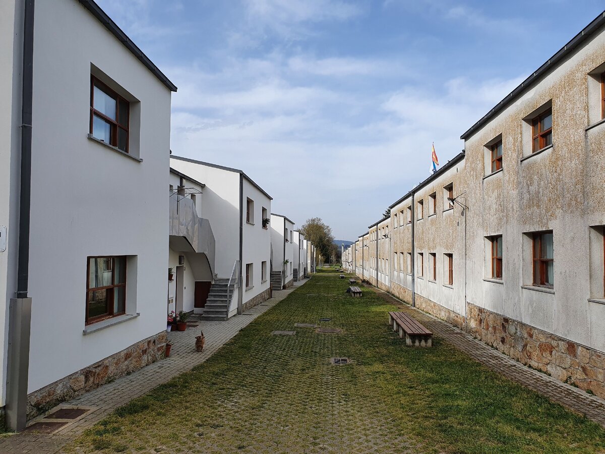 В этом месте я оказался случайно. Впоследствии пожалел, что не сделал остановку и не нащёлкал больше фотографий. Но в тот момент интуиция подсказывала: проходи поскорее, видишь же, это место излучает опасность. До этого я прошел через несколько десятков галисийских деревень, и все они были, так сказать, одинаковы в своём разнообразии. Вот ухоженные дома, вот разрушенные дома, вот коровник, вот лесопилка, все это в полном беспорядке. А тут сначала пошли заборы с надписями "Осторожно, взрывные работы", за которыми виднелись развалины здоровенных строений. А потом на вершине холма показались около сотни одинаковых домиков, построенных как по линейке. То ли жилых, то ли заброшенных, но с флагом Испании на крыше. Вместо названий улиц таблички "Павильон 1", "Павильон 2" и т.д. А посреди деревушки - кинотеатр на 350 мест. О кинотеатре я узнал позже, но он дополнил общую картину до полного сюрреализма. Моя первая ассоциация: искусственный городок, заселенный человеческими манекенами, который построили в пустыне Невада для изучения влияния атомного взрыва на городскую инфраструктуру. В общем, я прошел это место без остановки, но оно резануло по нервам и подтолкнуло меня к чтению архивов.