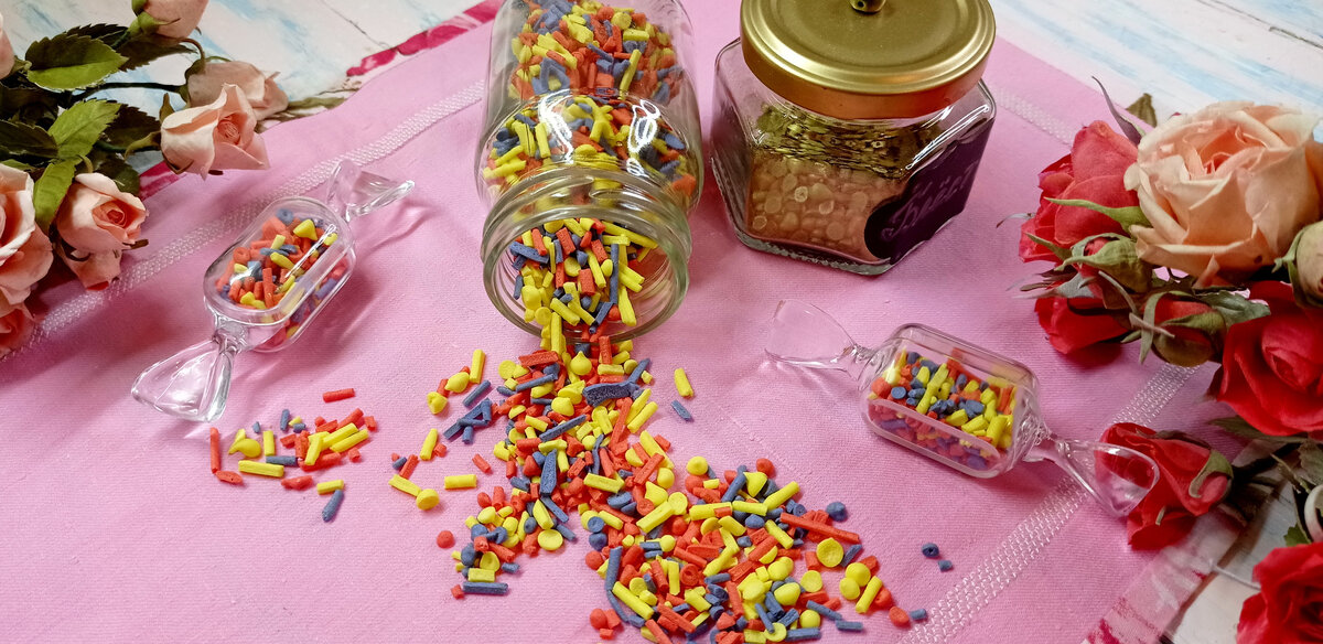 Разложить посыпку по баночкам . Некоторое ее количество можно отложить в отдельную емкость , добавить немного золотого кондурина и встряхнуть , закрыв плотно крышкой . Кондитерская посыпка покроется золотым напылением .