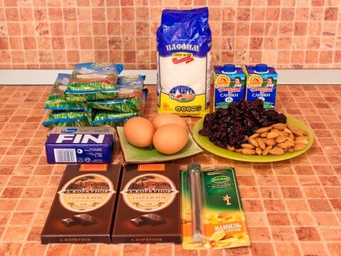 - 200 г цукатов (я использовала вяленую вишню)