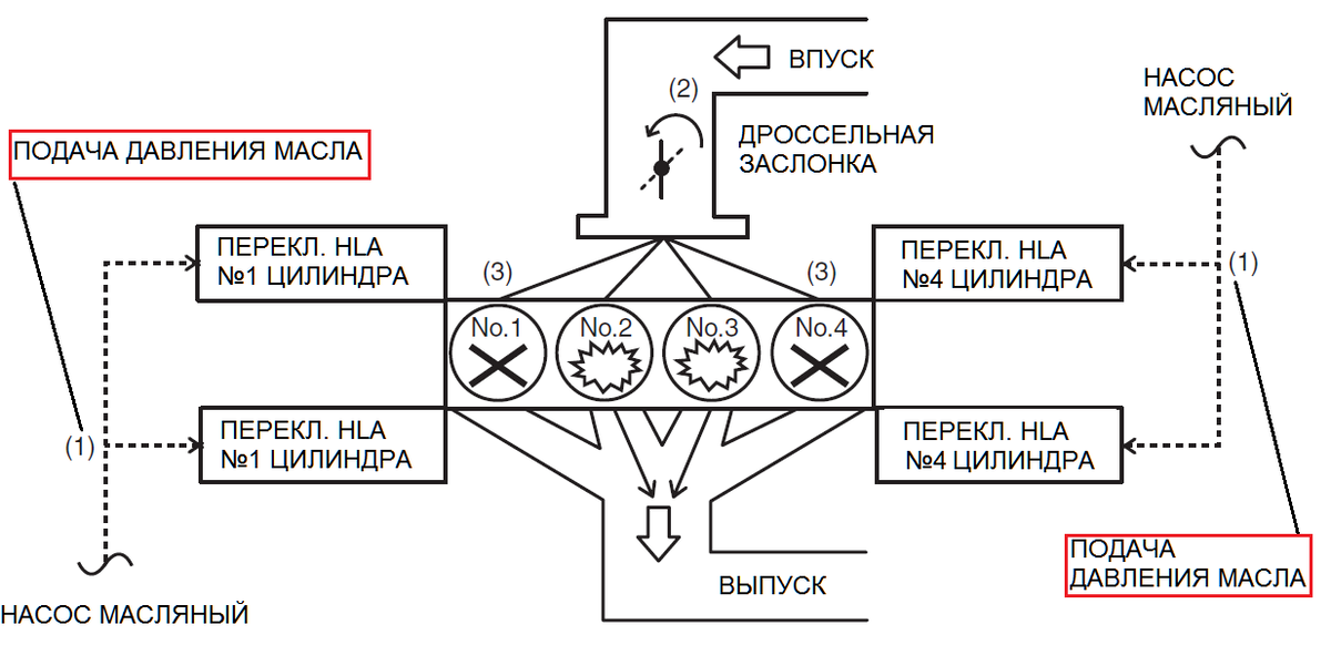 - Цилиндры 1 и 4 останавливаются (3) подачей давления масла (1) в переключаемые HLA, и транспортное средство приводится в движение с помощью работы 2 цилиндров.