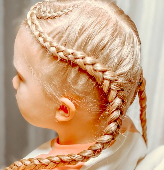 Возвращаемся к первой косе, доплетаем и фиксируем резинкой.