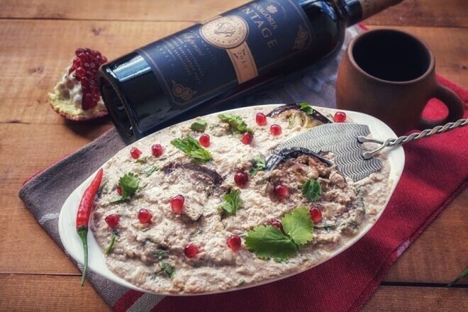Сациви является праздничной закуской и подаеться в глубоких тарелках, обязательно с лавашом и белым вином!