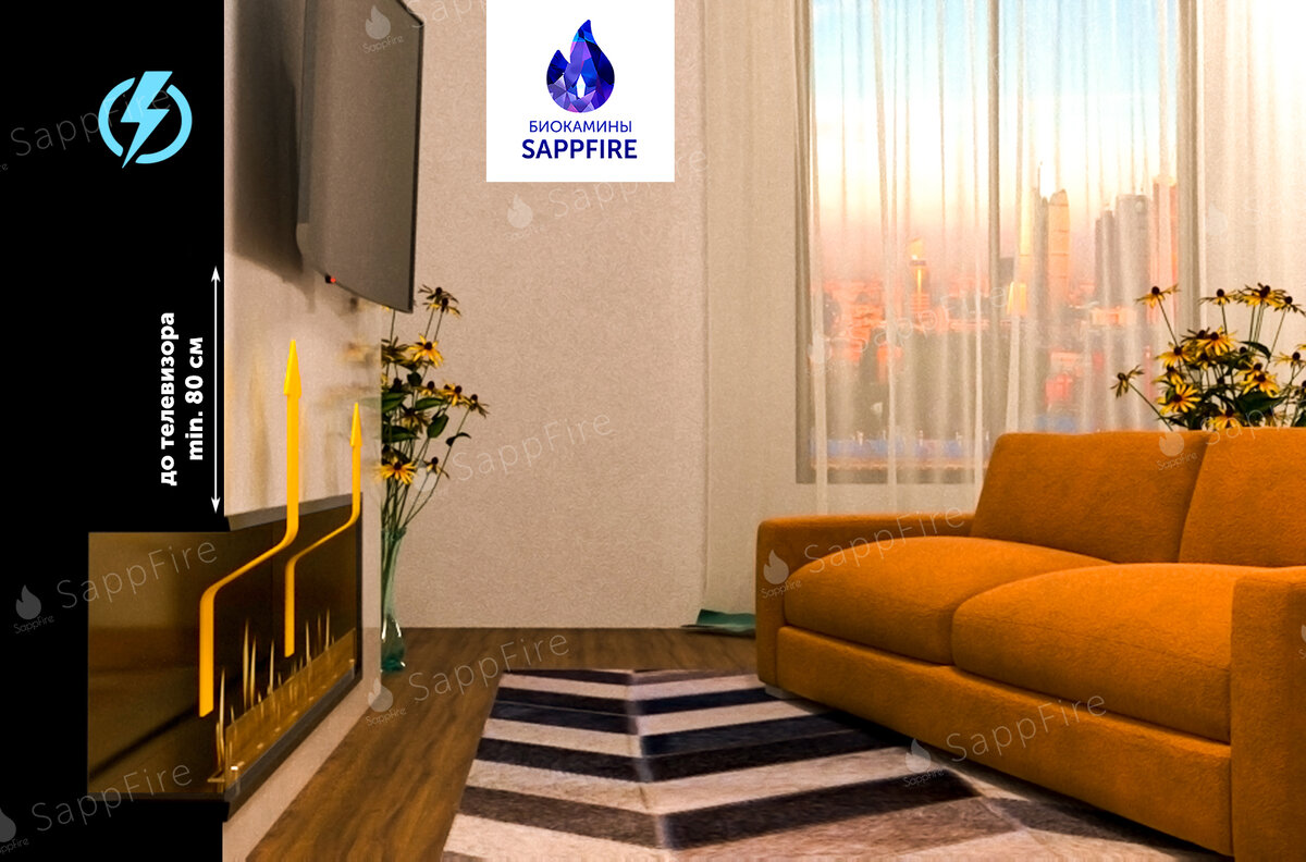 Заказчики компании SappFire, которые решили у нас купить камин , часто интересуются, как удачнее и выгоднее разместить биокамин в зоне телевизора. Не будет ли опасным устанавливать камин в непосредственной близости от телевизора или рядом со шторами или кондиционером?