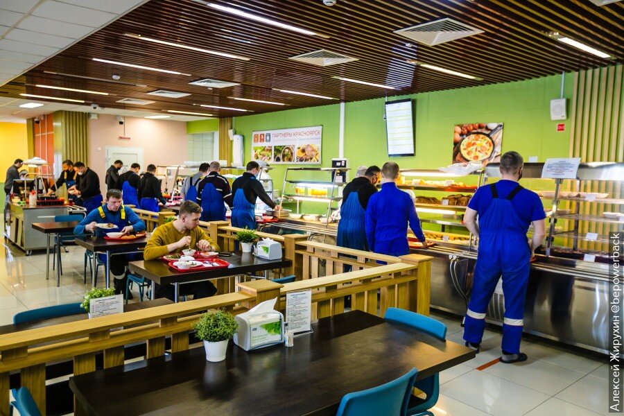 Столовая организована таким способом, чтобы сотрудники разных служб приходили сюда в разное время, поэтому даже при таком огромном количестве сотрудников и относительно небольшом помещении столовой, пробок тут не бывает.