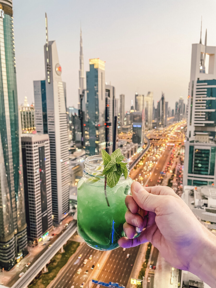 Эмиратцы любят копировать всё самое лучшее. Вот и этот бар расположился на крыше (54 этаж) отеля Address Sky View Hotel рядом с инфинити-бассейном, аналогичным сингапурскому Marina Bay Sands. Заказываем коктейль и красиво позируем с ним то у бассейна (там же, где я на фото), то с другой стороны террасы - на фоне небоскребов Шейх Зайд Роуд.