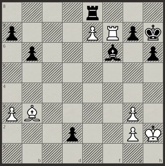 Предлагаю Вашему вниманию окончание партии Дикшид - Калианасиндарам, 1961 год. Белая пешка дошла до е7, но черные готовы ее немедленно забрать. Если черным удастся забрать белую пешку, то у них появляются шансы на победу. Однако белые начинают и выигрывают.