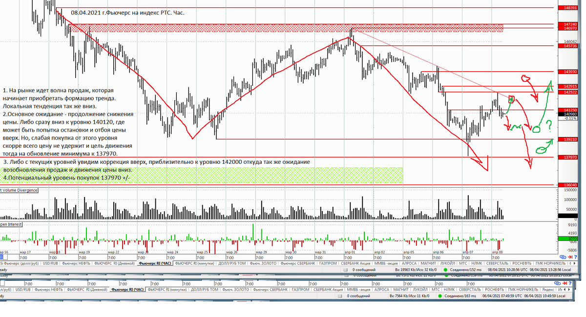 Очень интересными выдались торги последних пары дней. На рынке идет волна, развивается тенденция вниз. причем тенденция уже начинает приобретать формат тренда вниз и пока он подтверждается тем, что вчера у нас было обновление минимума во всей волне вниз. Разумеется мы говорим о часовом тренде. Вчера на проливе к 138000, движение цены вниз выкупили, и вроде как от объемов
