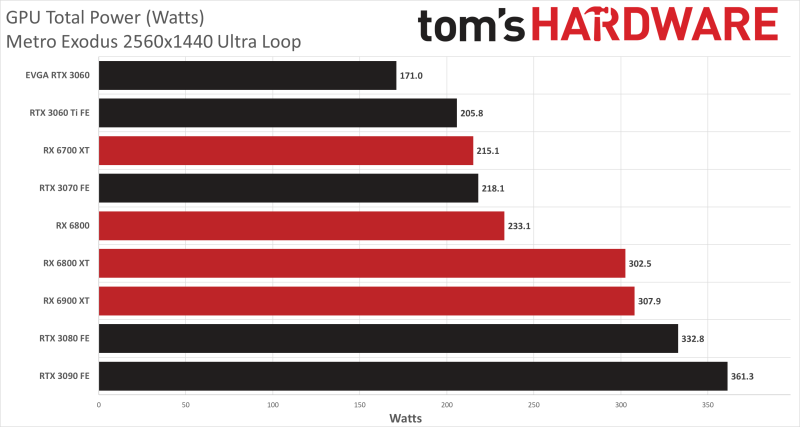 По графику видно, что начиная с графических процессоров последнего поколения, их общее энергопотребление приблизительно похожее. Больше всего энергии потребляют 3080 и 3090. За ними следуют три не менее новых карты: RTX 3070, RX 3060 Ti и RX 6700 XT. RTX 3060 снижает планку энергопотребления примерно на 35 Вт. AMD показывает лучшие результаты по сравнению с Nvidia, если сравнивать RX 6800 XT и RX 6900 XT с RTX 3080 и RTX 3090. Но тут стоит учитывать превосходство видеокарт Nvidia в мощности, поэтому в основном они равны.