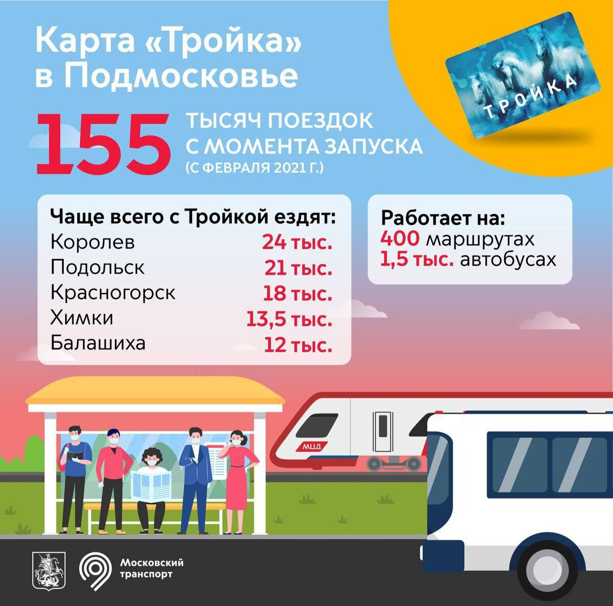 Сейчас карта уже работает более чем на 400 маршрутах, в 1,5 тысячах автобусах Московской области. Их число будет только расти — оплачивать поездки по Москве и Московской области одним проездным намного удобнее. Вот в каких городах «Тройку» выбирают чаще всего⬆