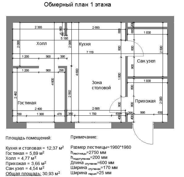 Этап 2. После определения общей концепции, т.е. идеи, выполняем замеры помещения. Полагаться на план БТИ не стоит, необходимо перемерить все помещение самому и зафиксировать данные замеров на распечатанную планировку (план БТИ). Не забываем отметить и замерить коммуникации. Чертим план вручную или при помощи программы уже с реальными замерами. Это будет обмерным планом, который является основой дизайна будущего интерьера.